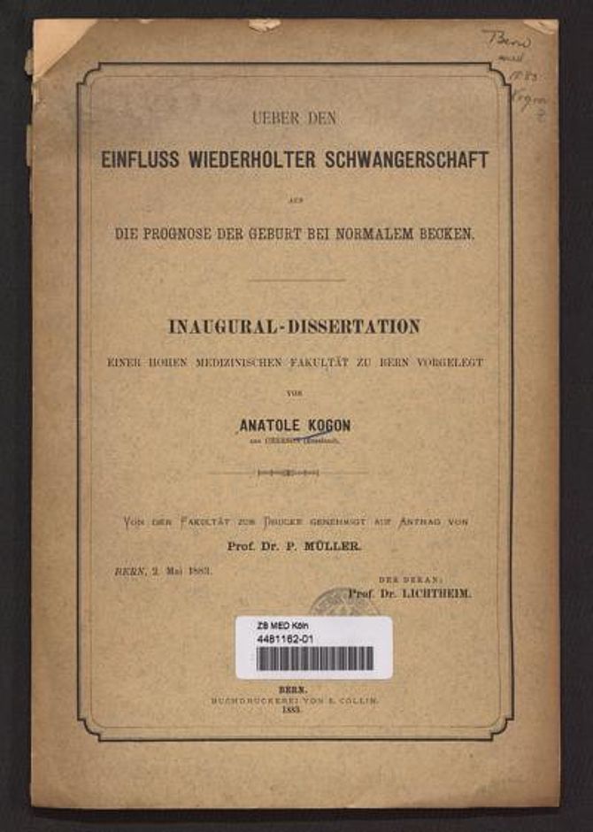 The dissertation was written by the physician from Kherson in 1883 in Bern. The title is now part of the Digital Collection Obstetrics. Like all works digitised by ZB MED, this dissertation can now be freely used online worldwide. The Digital Collections of ZB MED are constantly being added to. Collections from various areas of the life sciences are available, for example the collections on vaccinations, balneology, special plant cultivation, milk and dairy or the history of medicine. Using various search options, the titles recorded can be indexed and processed - even individually.