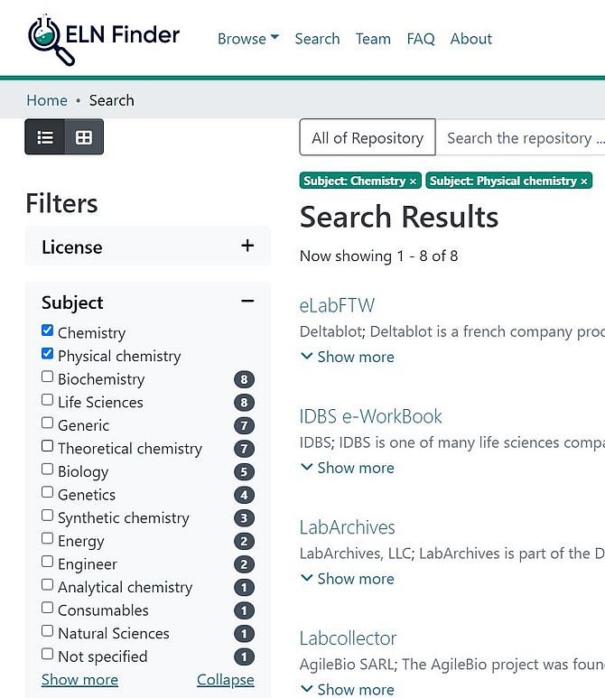 At the suggestion of the National Research Data Infrastructure for Chemistry (NFDI4Chem), the ELN Finder has been given extended criteria for the search for a suitable Electronic Lab Notebook (ELN). In the NFDI4Chem Knowledgebase, the aim was to display suitable ELNs for subdisciplines. The ELN Finder now makes it possible to filter not only by scientific disciplines such as chemistry, biology, genetics, etc., but also by subject. In chemistry, it is also possible to search for the following subdisciplines: