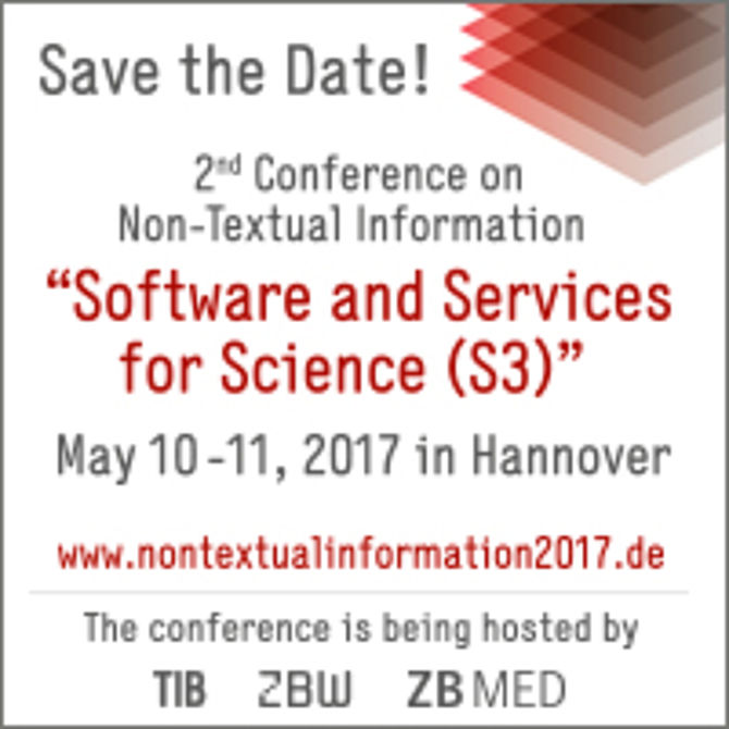 Die 2nd Conference on Non-Textual Information beschäftigt sich unter dem Titel „Software and Services for Science (S3)” schwerpunktmäßig mit den Themen Nachhaltigkeit und Referenzierung von wissenschaftlicher Software, Trends in der Programmierpraxis, dem Austausch von Software sowie rechtlichen Aspekten. Die englischsprachige Veranstaltung bietet ein Forum für den Austausch zwischen Infrastruktureinrichtungen sowie Nutzerinnen und Nutzern zu den Anforderungen, Erwartungen und Bedürfnissen an wissenschaftliche Software in der Praxis. Teilnehmerinnen und Teilnehmer können sich ab sofort anmelden. Noch bis zum 31. März 2017 gilt der ermäßigte Early-Bird-Tarif.