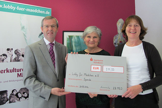 Köln – Zu Beginn des Sommersemesters verkaufte die ZB MED – Leibniz-Informationszentrum Lebenswissenschaften aussortierte Lehrbücher aus dem Bestand der Medizinischen Abteilung der Universitäts- und Stadtbibliothek Köln. Der Erlös ging in diesem Jahr an die gemeinnützige Organisation LOBBY FÜR MÄDCHEN e.V.. Ende Juni übergaben Ulrich Korwitz und Heike Schmidt von der ZB MED 511,50 Euro an Beatrice Braunisch, Geschäftsführerin der LOBBY FÜR MÄDCHEN. Der Verein engagiert sich für Mädchen und junge Frauen in Problemsituationen.