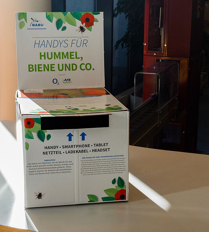 Mit der Sammelbox unterstützt ZB MED das Projekt "Handys für Hummel, Biene & Co." des Naturschutzbundes Deutschland e.V. (NABU). Der NABU setzt sich damit für ein besseres Handy-Recycling zur Schonung von Umwelt und Ressourcen ein. Der Verein arbeitet zusammen mit der Telefónica Deutschland Group, die für die gesammelten Handys einen festen Betrag spenden. Diese Spende fließt direkt in in den NABU-Insektenschutzfonds.