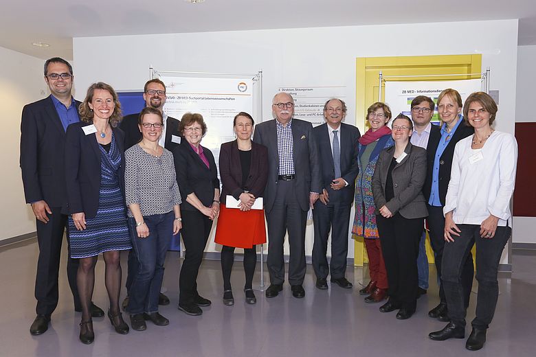 Christoph Poley, Elke Roesner, Uta Parmaksiz, Fabian Gail, Beate Brüggemann-Hasler (alle ZB MED), Dr. Britta Horstmann (Leibniz-Geschäftsstelle), Prof. Dr. Matthias Kleiner (Leibniz-Präsident), Dr. Dietrich Nelle, Dr. Ursula Zängl, Dr. Jasmin Schmitz, Bernd Müller, Dr. Elisabeth Müller, Birte Lindstädt (alle ZB MED)Foto: ZB MED / Friedemann Reinhold