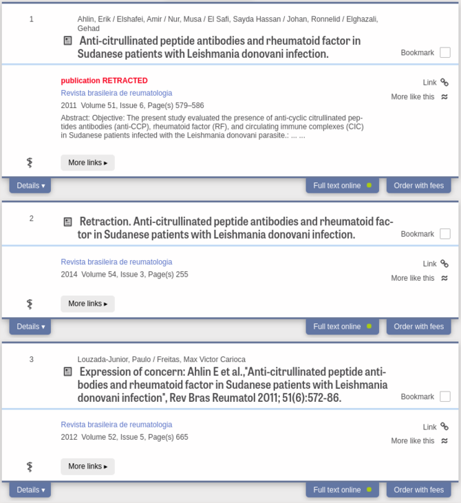 Um eine Weiterverbreitung der Fehler zu vermeiden, sollten zurückgezogene Artikel nicht zitiert werden. Wie lässt sich das zuverlässig vermeiden? Hier setzt das neue Feature von LIVIVO an. Die Retractions werden so markiert, dass sie bei der Auswahl der verwendeten Publikationen in einer Recherche deutlich erkennbar sind. Die offizielle Meldung der Retraction und falls vorhanden der "Letter of concern" sind verlinkt. Dies trägt bei zu mehr Transparenz in der Forschung und beugt der Verbreitung falscher Forschungsergebnisse vor.