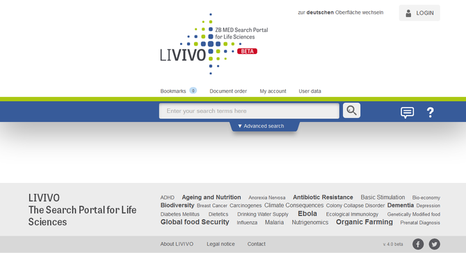 Die Lebenswissenschaften sind ein verzahntes Wissensgebiet. Demographischer Wandel, Klimaerwärmung, Zivilisationskrankheiten – dies sind nur einige Beispiele für Themen, die sich nicht eindeutig einer Disziplin zuordnen lassen. Um seinen Kundinnen und Kunden eine umfassendere interdisziplinäre Literaturrecherche zu ermöglichen, hat ZB MED seine beiden Suchportale MEDPILOT und GREENPILOT zu einem Portal zusammengefasst. Das neue Portal LIVIVO bietet eine zeitgleiche Recherche in allen Fachgebieten von ZB MED. Die Suche beschränkt sich dabei nicht auf die eigenen Bestände: LIVIVO durchsucht rund 55 Millionen Datensätze aus über 45 Fachdatenquellen.