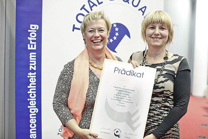 Am 28. Oktober 2013 wurde das TOTAL E-QUALITY-Prädikat an die Gleichstellungsbeauftragten der ZB MED, Claudia Weßler und Helga Wolf, übergeben. Die ZB MED wurde damit gemeinsam mit 58 weiteren Organisationen für ihr Engagement für Chancengleichheit ausgezeichnet. „Die Führungspersönlichkeiten unserer Prädikatsträger haben erkannt, dass gelebte und in der Organisation fest verankerte Chancengleichheit zu mehr Erfolg führt. Ganz ohne gesetzliche Vorgaben präsentieren sie sich als zukunftsweisende Vorbilder“, sagte Eva Maria Roer, Vorsitzende des TOTAL E-QUALITY Deutschland e.V. bei der Prädikatsübergabe an die ZB MED.