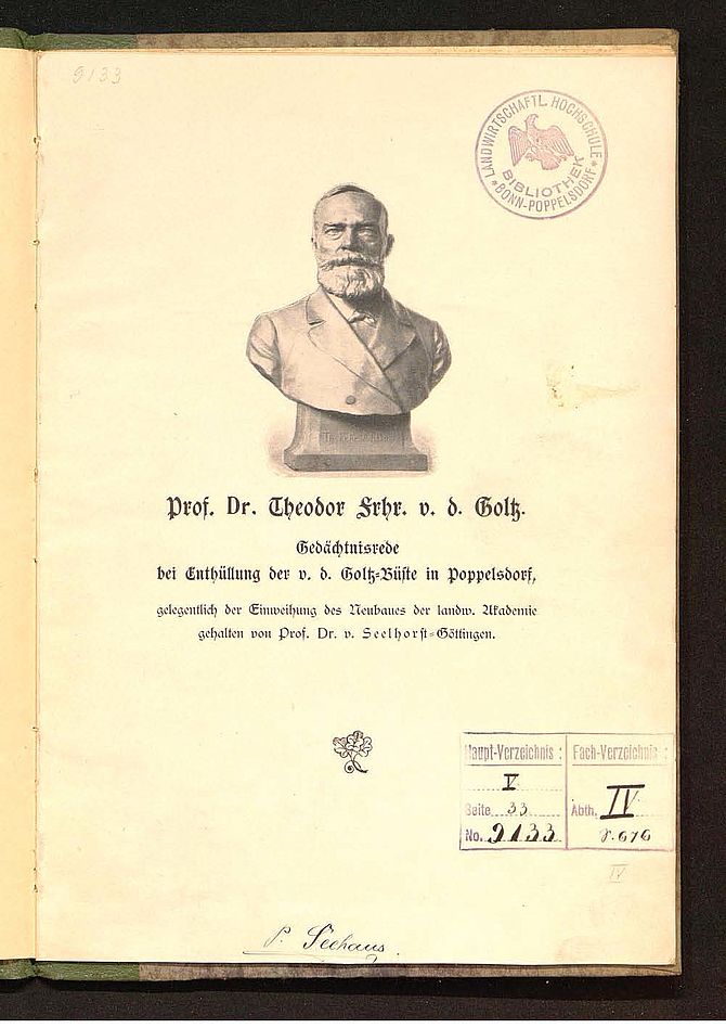1896 wurde der aus Koblenz stammende Theodor Freiherr von der Goltz aus der ostpreußischen Linie der bekannten märkischen Adelsfamilie Direktor der Königlich Preußischen Landwirtschaftlichen Akademie in Bonn-Poppelsdorf. Die Akademie ist die Vorgängereinrichtung der heutigen Landwirtschaftlichen Fakultät der Universität Bonn, die Akademiebibliothek die Vorgängerin des Bonner Standortes von ZB MED.