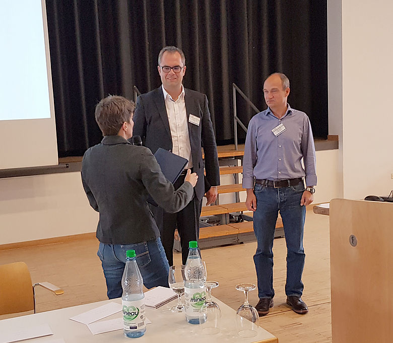 Christoph Poley, bei ZB MED als Entwickler für den neuen Dienst verantwortlich, und Dr. Helge Knüttel, Fachreferent für Medizin an der Universitätsbibliothek Regensburg, nehmen die Auszeichnung im Wettbewerb „Leuchtturm-Projekte an Medizinbibliotheken“ von Dr. Iris Reimann, Vorsitzende der AGMB, entgegen.