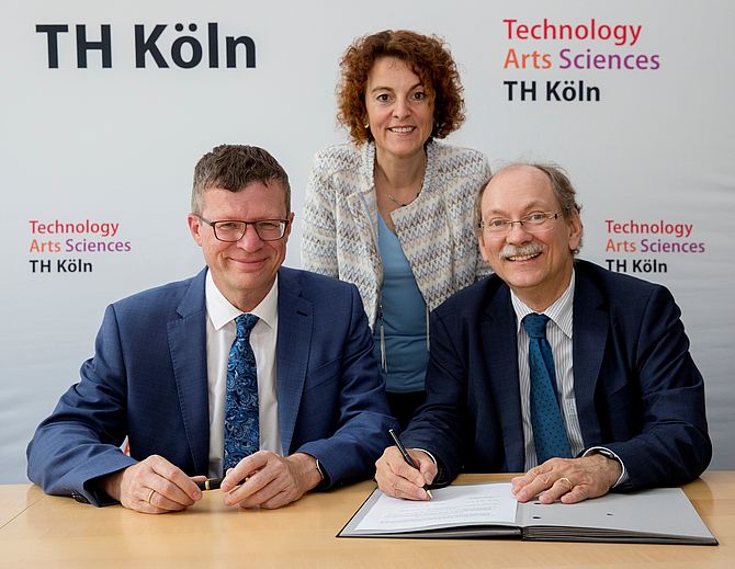 Unterzeichnung der Kooperationsvereinbarung: Prof. Dr. Klaus Becker, Geschäftsführender Vizepräsident der TH Köln, Prof. Dr. Simone Fühles-Ubach, Dekanin der Fakultät für Informations- und Kommunikationswissenschaften, und Dr. Dietrich Nelle, Interimsdirektor ZB MED (v.l.) (Bild: Michael Bause/TH Köln)