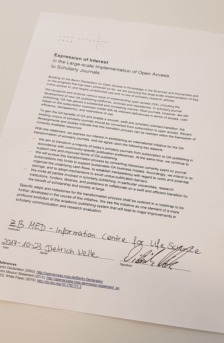 „Der direkte Zugang zu wissenschaftlichen Informationen, insbesondere zu Fachartikeln und Forschungsdaten, ist heute ein entscheidender Faktor für wissenschaftlichen Fortschritt,“ stellt Dr. Dietrich Nelle, Interimsdirektor von ZB MED, fest. „Mit OA2020 treten Organisationen verschiedenster Disziplinen weltweit an, um diesen Zugang zu ermöglichen. Wir von ZB MED verfolgen dasselbe Ziel. Mit gebündelter Kraft und koordinierten Aktivitäten kommen wir diesem Ziel gemeinsam näher.“