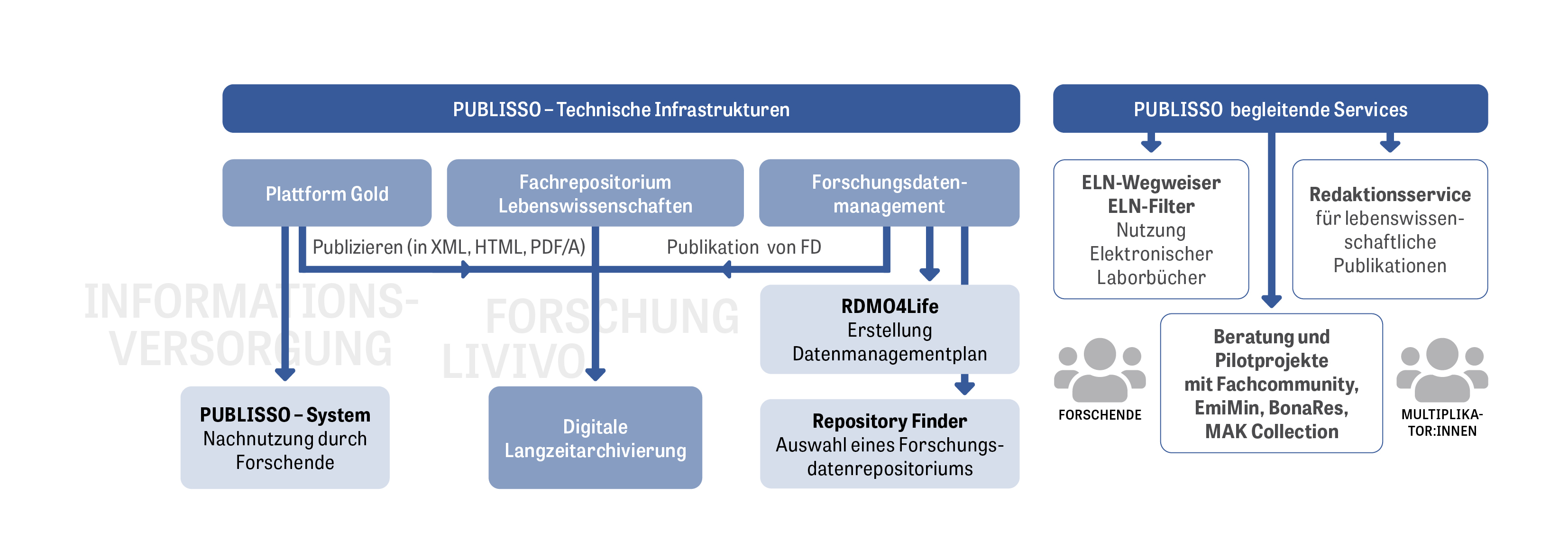 Die Services von ZB MED im Bereich Datenmanagement- und Publikationsinfrastruktur leisten einen Beitrag zur Literaturversorgung in den Lebenswissenschaften. Dabei stehen Qualitätssicherung und niedrigschwellige Publikations- und Datenmanagement-Angebote im Vordergrund. ZB MED bietet einen umfassenden Service von der Begleitung bei der Auswahl von elektronischen Laborbüchern und der individuellen (Publikations-)Beratung im Bereich Open Access und Open Science bis zum Angebot einer entsprechenden (Publikations-)Infrastruktur. Das Publikationsportal PUBLISSO ist der Zugang zu den verschiedenen Services.